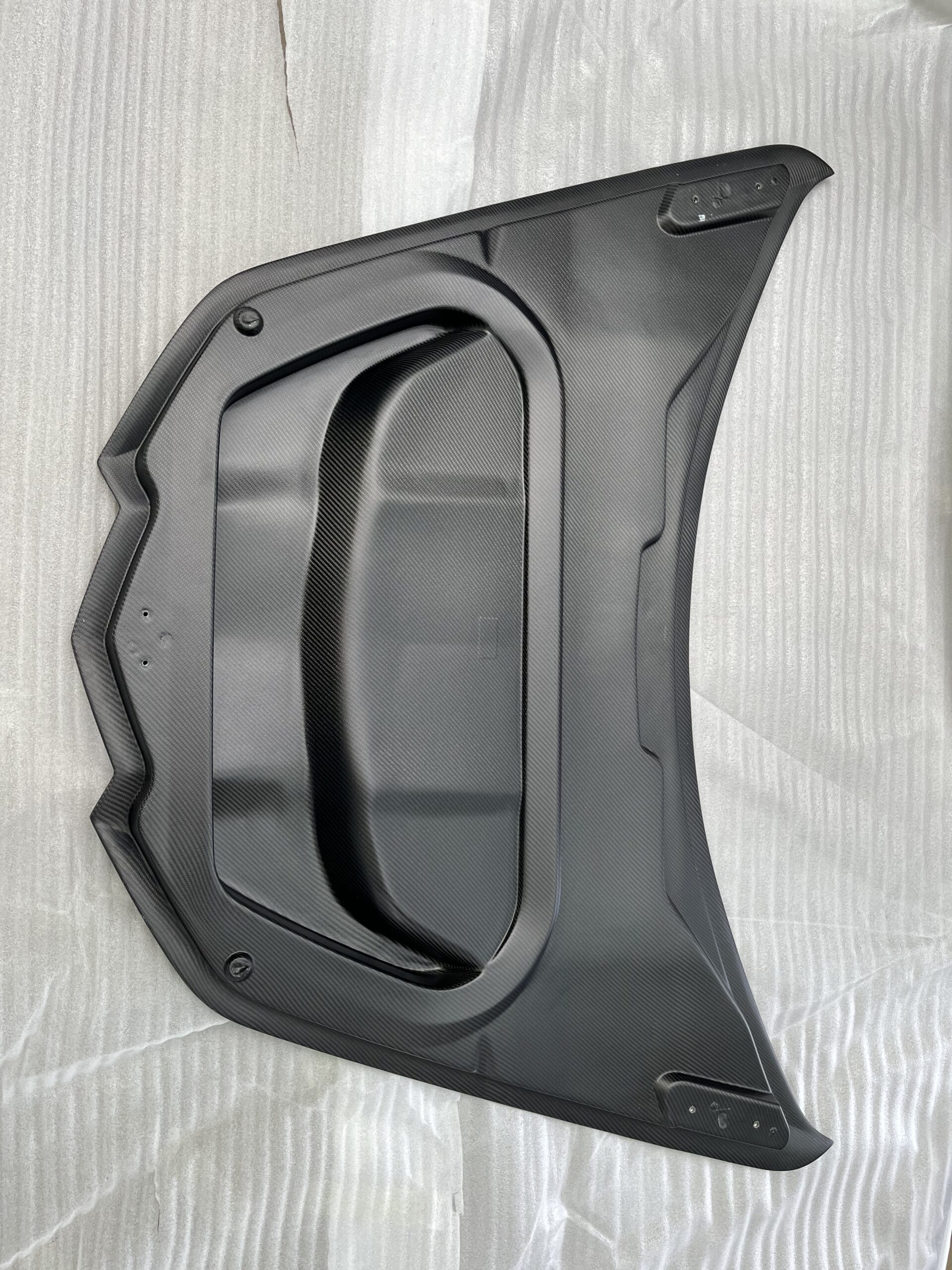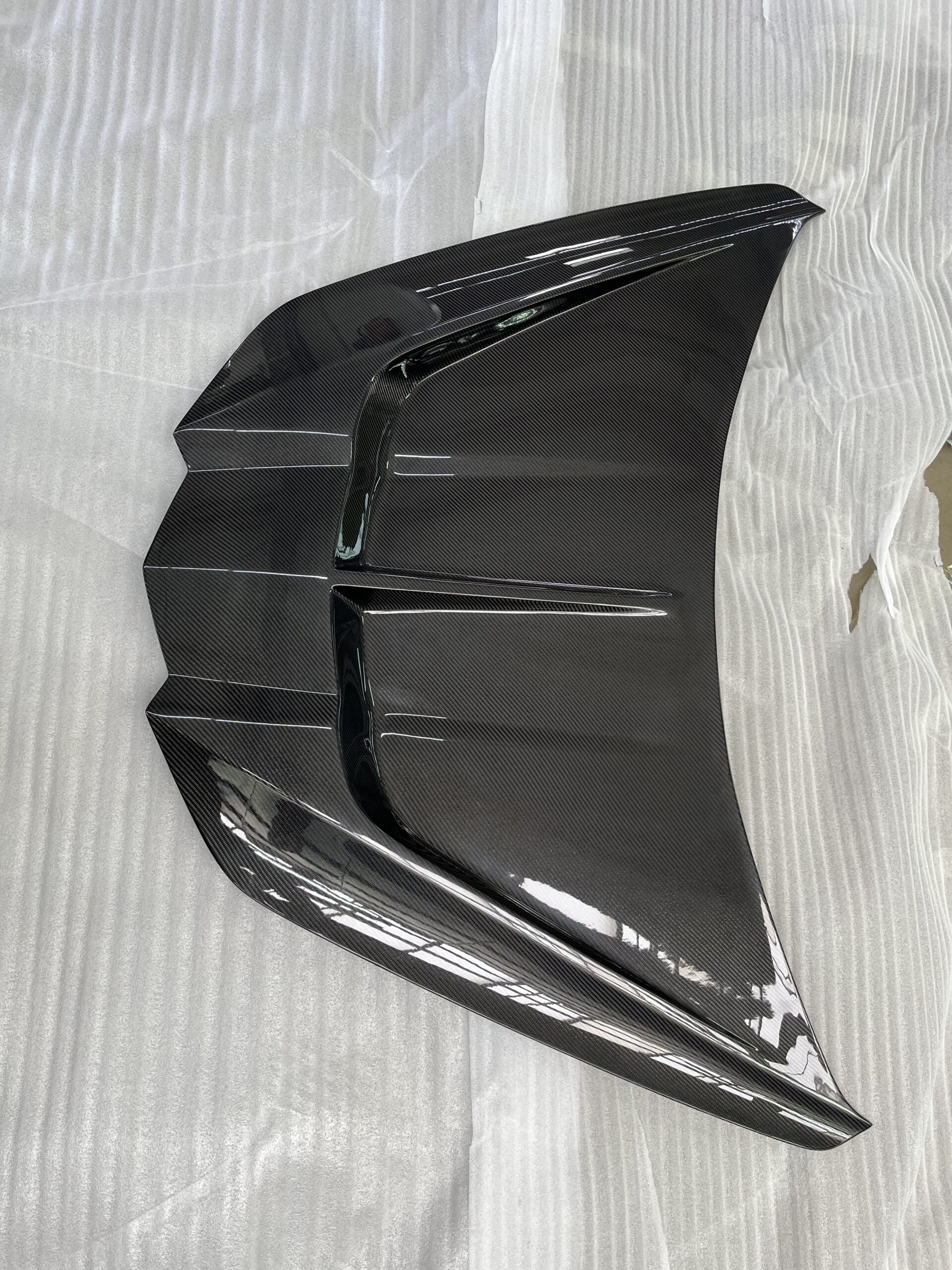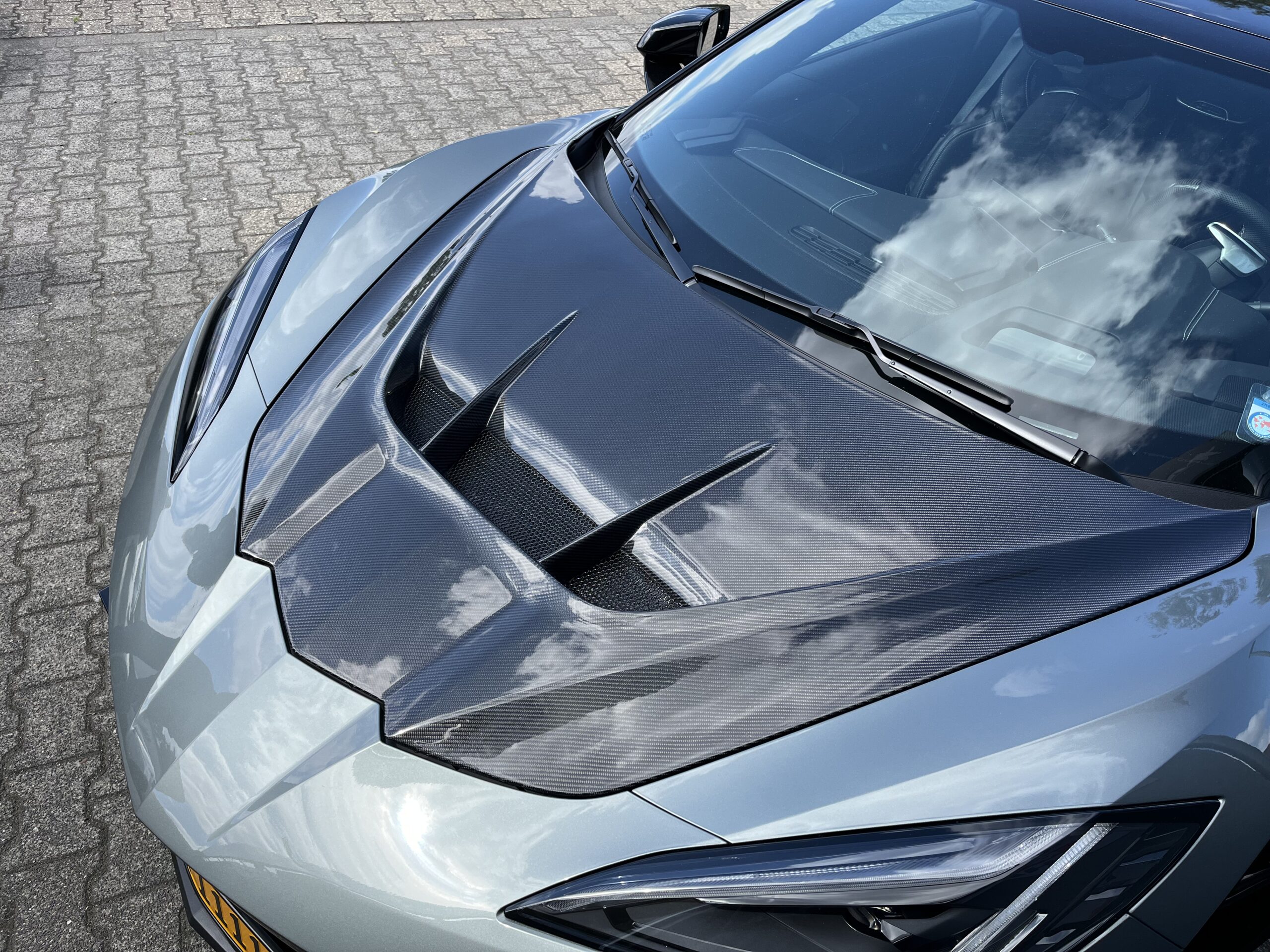 Die Haube ist doppelwandig aufgebaut. Die Innenschale entspricht der OEM-Geometrie, dadurch bleibt der Frunk-Bereich unverändert – keine zusätzliche Einbuchtung, kein „verlorener“ Stauraum. Das Gitterelement ist konstruktiv sauber zwischen Innen- und Außenschale integriert.